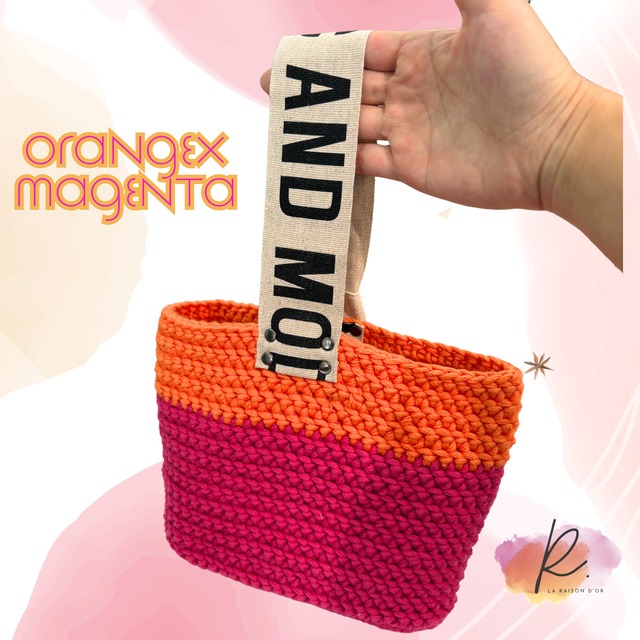 軽やかなコットン糸で編み上げた、シンプルで使いやすいワンハンドルバッグです。 カラーは4色展開。 •オレンジ×マゼンタ:コーデのアクセントになる華やかな組み合わせ 底部分には合皮を使用しているため、汚れにくく日常使いに安心。 お財布、タオル、メイクポーチ、ハンディファンなど、お出かけ必需品がしっかり入るサイズ感です。 シンプルなデザインだから、ビーズ刺繍のブローチを合わせて自分らしくアレンジするのもおすすめ。 お出かけやお買い物、旅行のサブバッグとしても大活躍します。