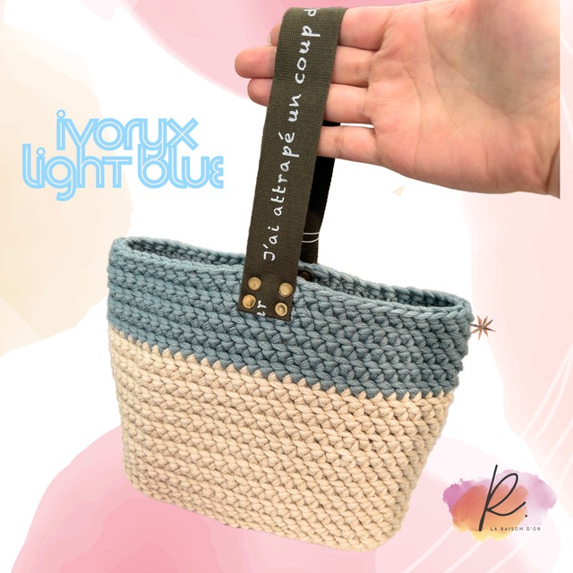 軽やかなコットン糸で編み上げた、シンプルで使いやすいワンハンドルバッグです。 •アイボリー×ライトブルー:爽やかで季節問わず使いやすいカラー 底部分には合皮を使用しているため、汚れにくく日常使いに安心。 お財布、タオル、メイクポーチ、ハンディファンなど、お出かけ必需品がしっかり入るサイズ感です。 シンプルなデザインだから、ビーズ刺繍のブローチを合わせて自分らしくアレンジするのもおすすめ。 お出かけやお買い物、旅行のサブバッグとしても大活躍します。
